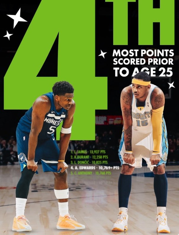 爱德华兹25岁前的总得分超越卡梅隆·安东尼,上升至NBA历史第四,仅次于詹姆斯、杜兰特和东契奇。